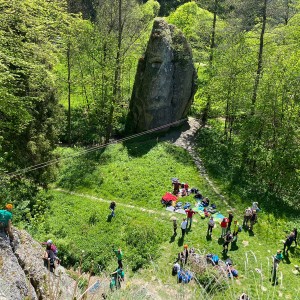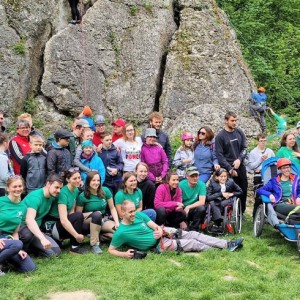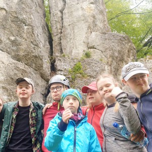 Dzięki ekipie Miłosza z fundacji Sprawne Wspinanie dzieciaki z „Tęczy” wspinały się po prawdziwej ścianie skalnej o wdzięcznej nazwie Dupa Słonia. Oprócz wspinania zorganizowane były warsztaty obsługi sprzętu wspinaczkowego, aby każdy kto jeszcze nie próbował wspinaczki mógł się podszkolić a praktycy wspinaczkowi poćwiczyć. Czas upłynął nam na miłych pogawędkach i kibicowaniu tym, którzy byli aktualnie na ścianie. Gdy już wszyscy, co chcieli, się powspinali, przeszliśmy spacerkiem do bazy wspinaczkowej na część kulinarną i tam relaksowaliśmy się przy kiełbaskach z ogniska i grze w piłkę. To był naprawdę świetny czas!