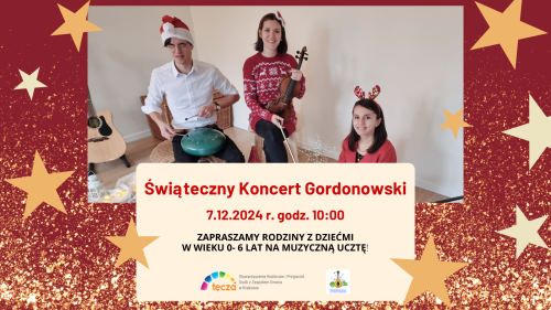 Serdecznie zapraszamy rodziny z dziećmi na wyjątkowy, świąteczny koncert gordonowski prowadzony przez Tomasza Kurnika z Papaja – umuzykalniające zajęcia gordonowskie oraz Joannę Pudlik i Małgorzatę Bednarczyk. -