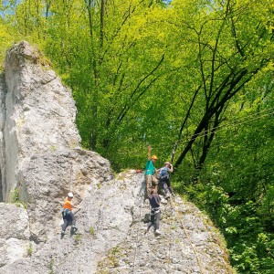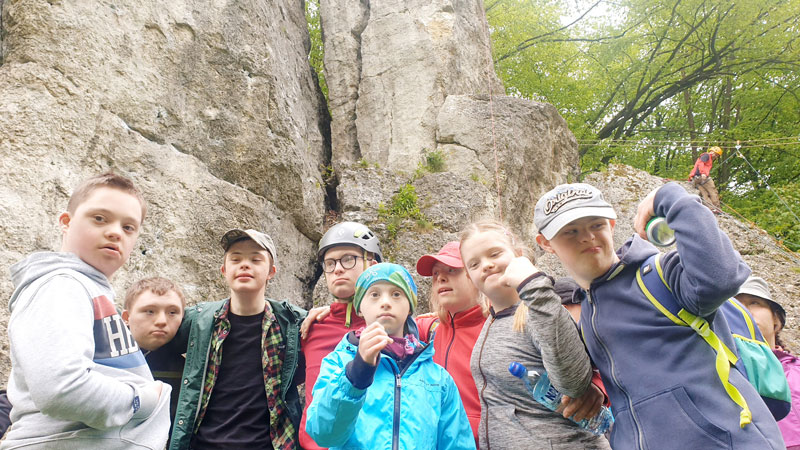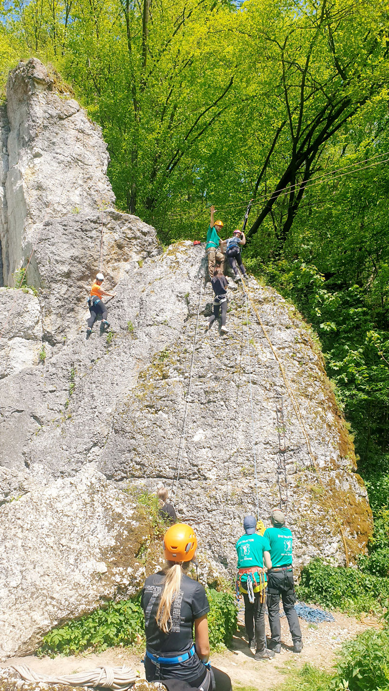 Dzięki ekipie Miłosza z fundacji Sprawne Wspinanie dzieciaki z „Tęczy” wspinały się po prawdziwej ścianie skalnej o wdzięcznej nazwie Dupa Słonia. Oprócz wspinania zorganizowane były warsztaty obsługi sprzętu wspinaczkowego, aby każdy kto jeszcze nie próbował wspinaczki mógł się podszkolić a praktycy wspinaczkowi poćwiczyć. Czas upłynął nam na miłych pogawędkach i kibicowaniu tym, którzy byli aktualnie na ścianie. Gdy już wszyscy, co chcieli, się powspinali, przeszliśmy spacerkiem do bazy wspinaczkowej na część kulinarną i tam relaksowaliśmy się przy kiełbaskach z ogniska i grze w piłkę. To był naprawdę świetny czas!